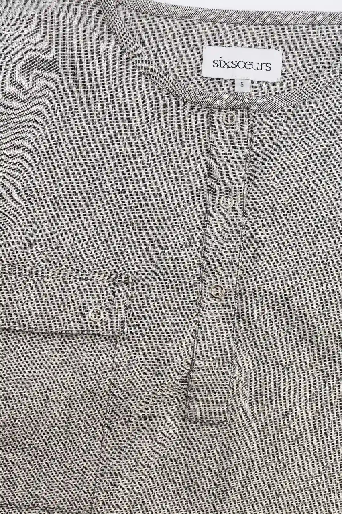 Top loose manches courtes, col arrondi patte milieu devant, 1 poche plaquée à rabat côté cœur, pressions métal nickel. Lin coton mouliné gris et noir.