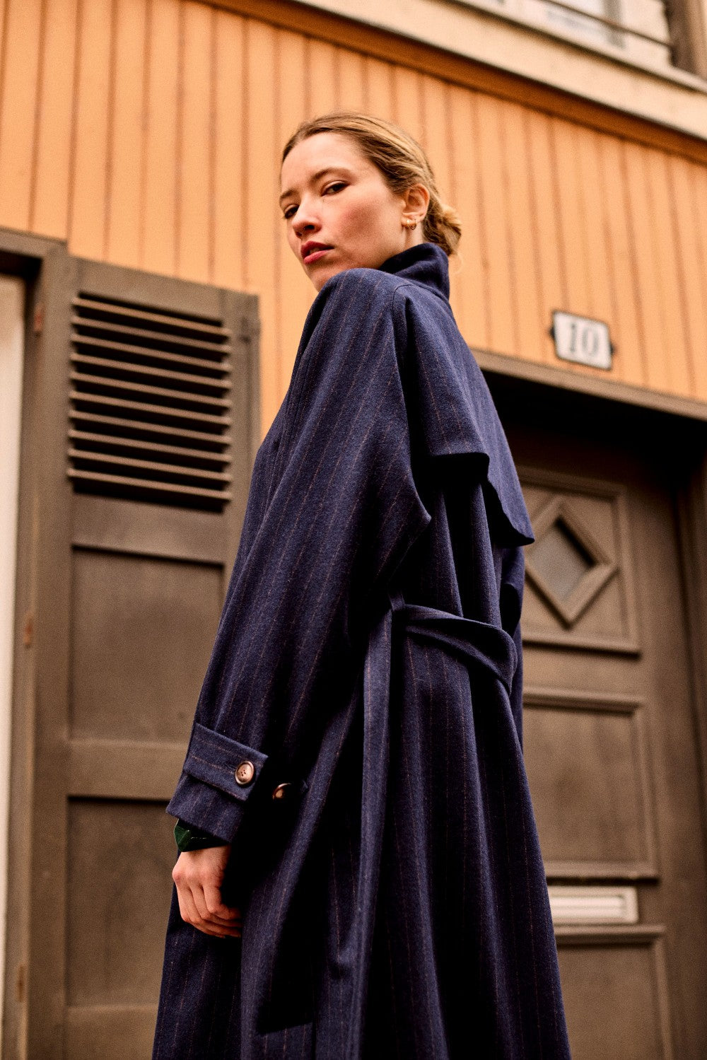 Col montant asymétrique, bas côté boutonnés, ceinture, bavolet dans le dos. Manteau de mi-saison élégant et intemporel.