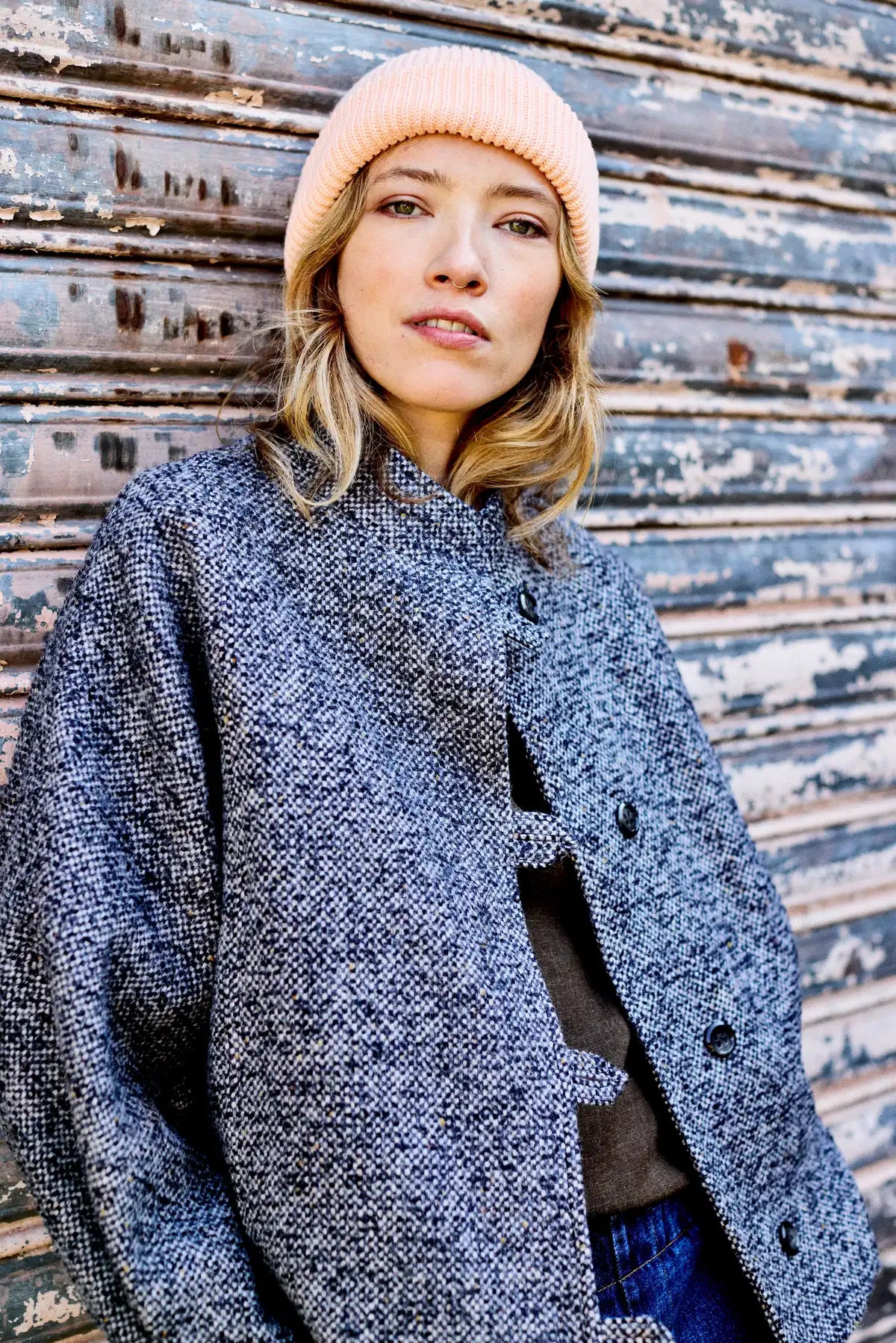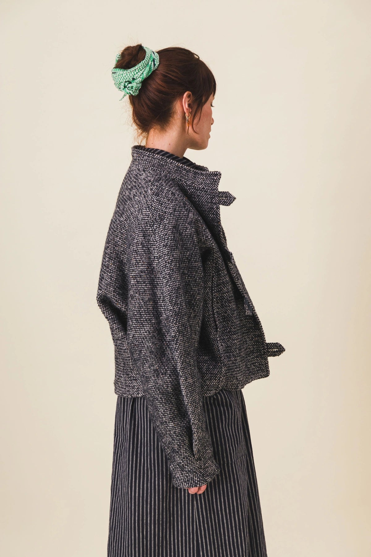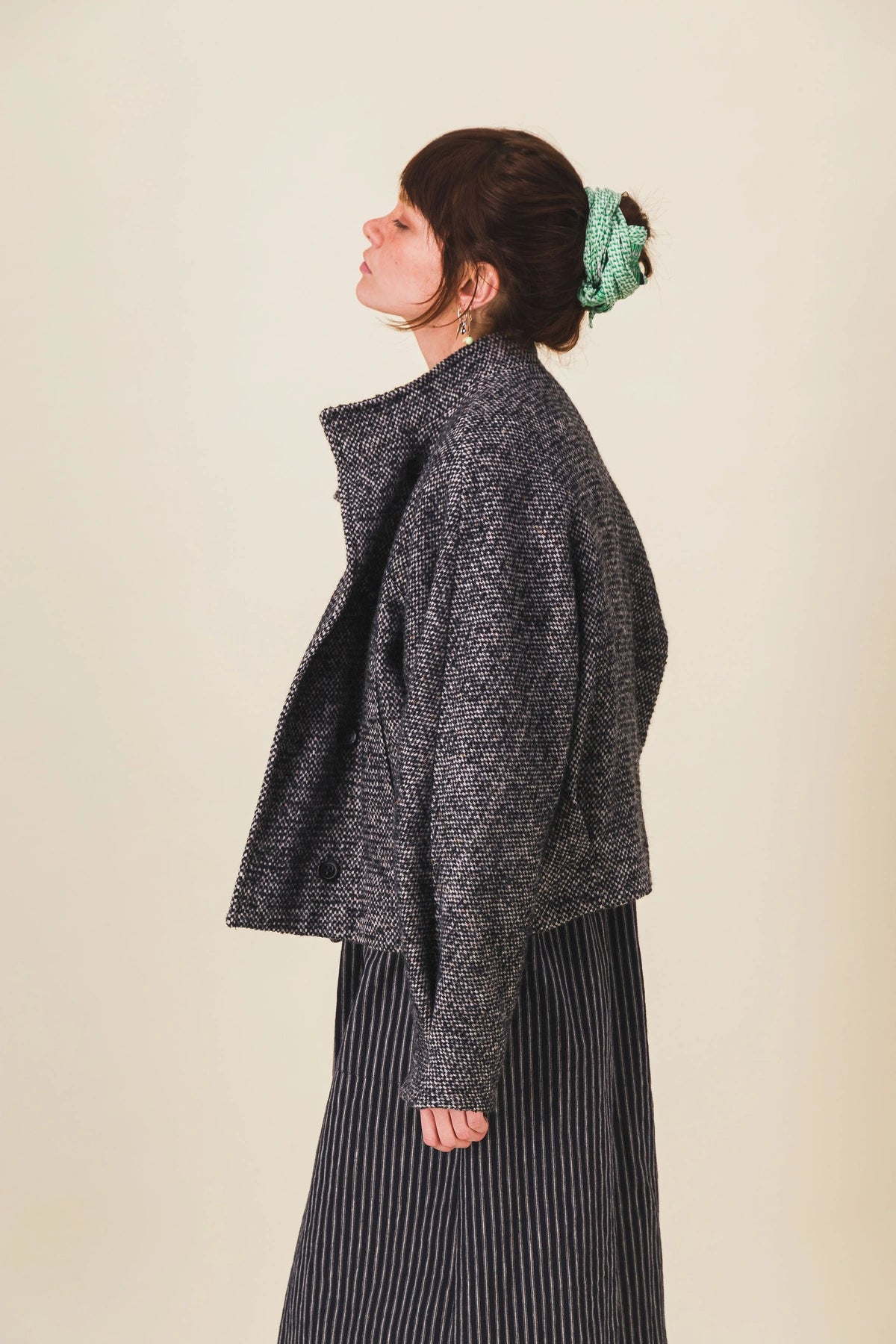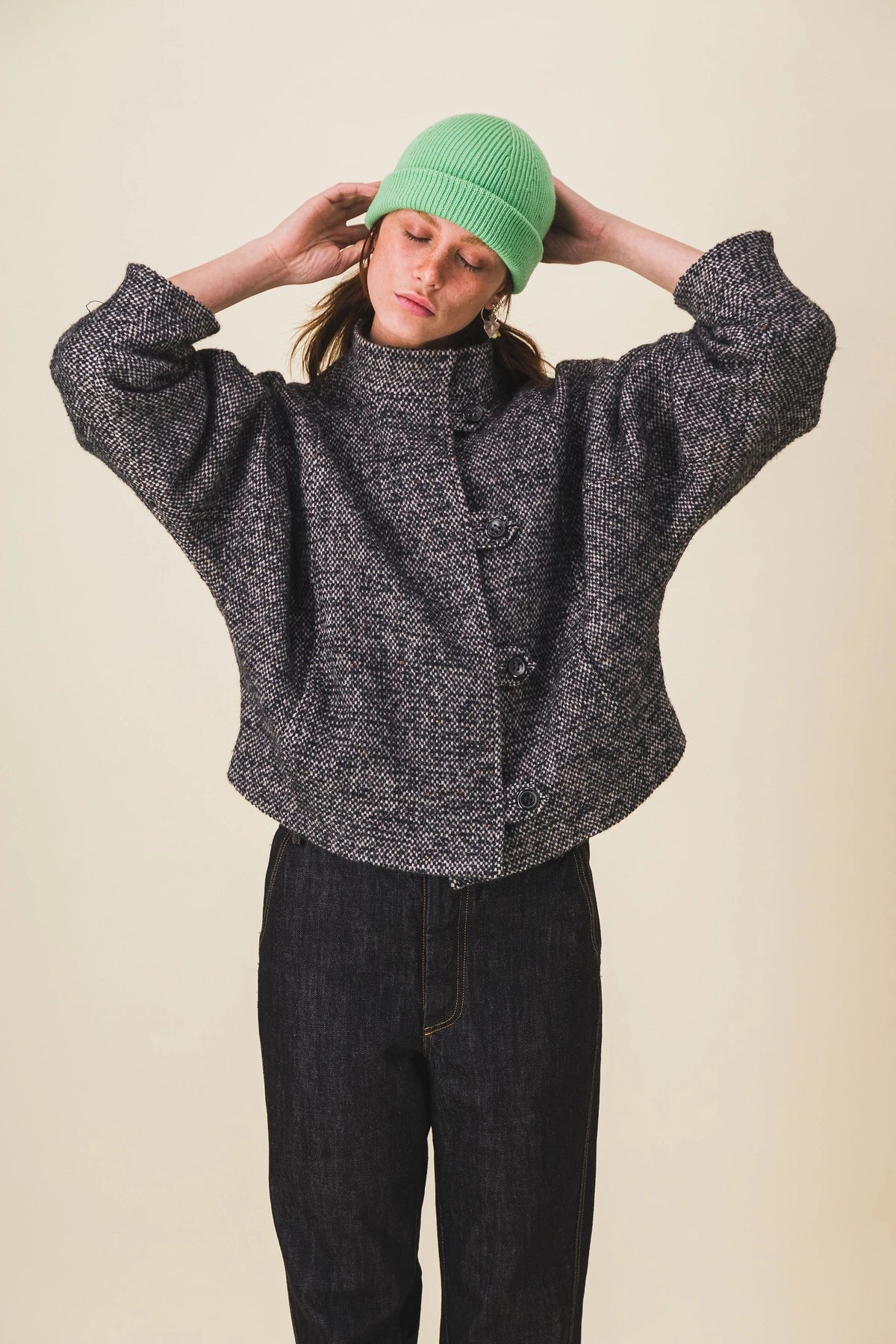 Blouson court pour femme en laine avec des fermetures à brides boutonnées, un col montant et des manches chauve-souris.