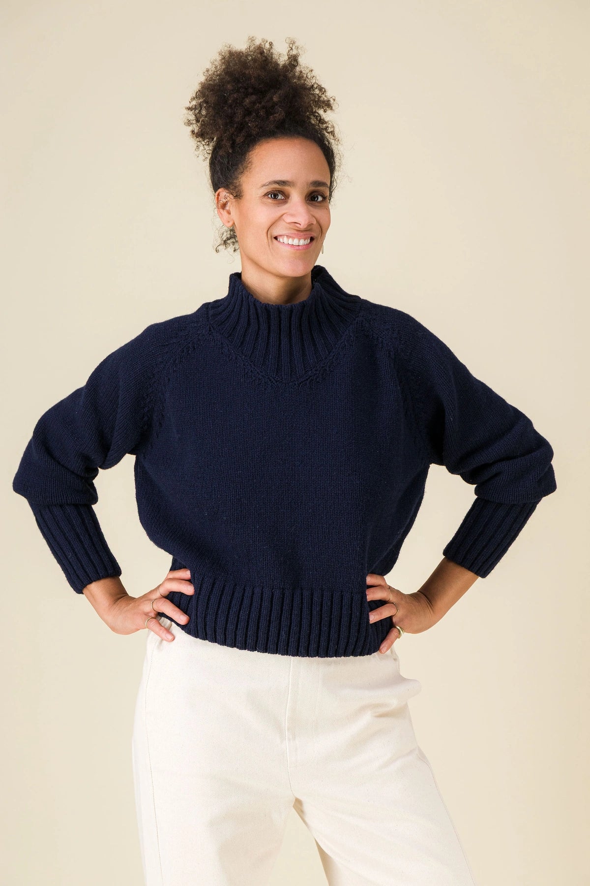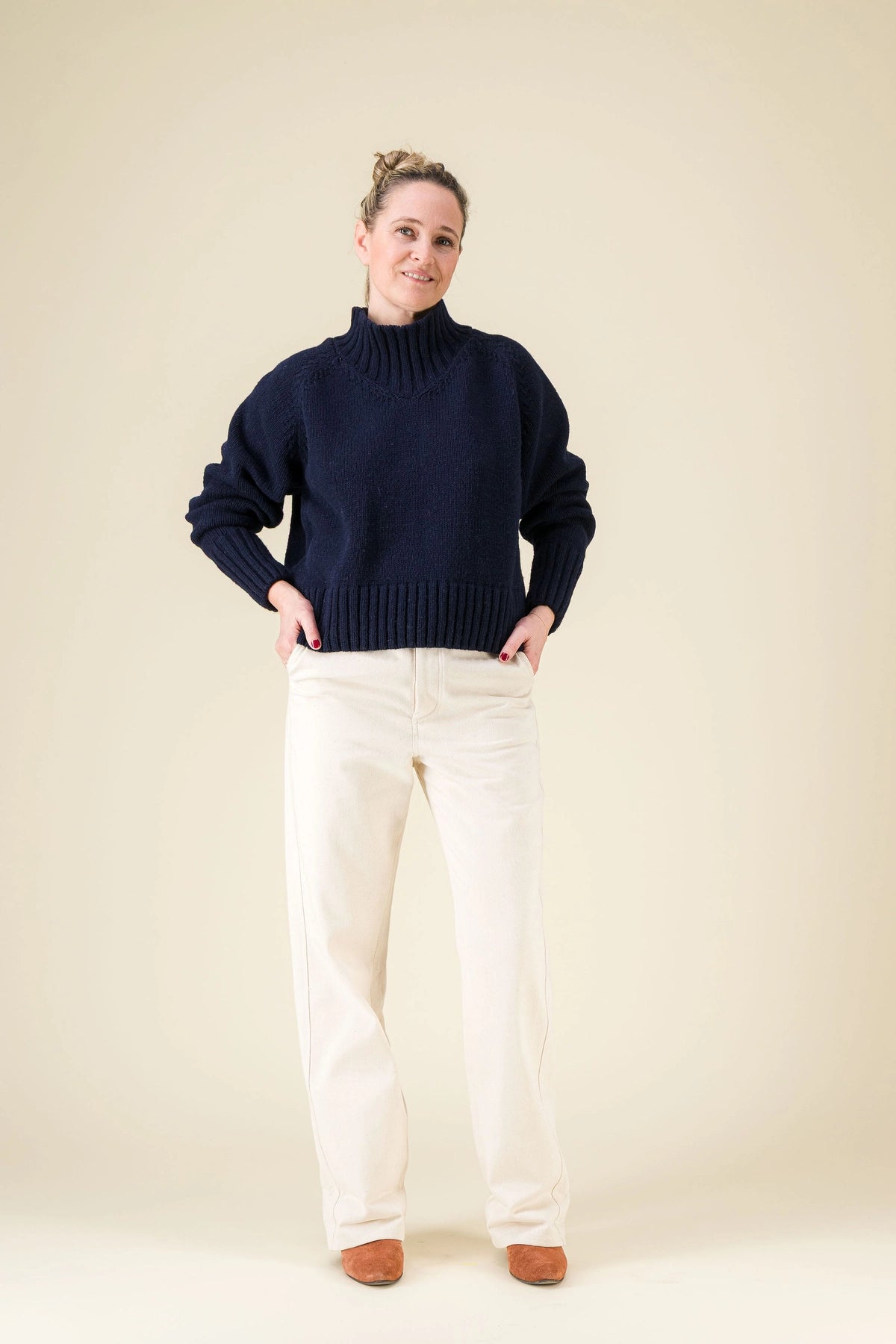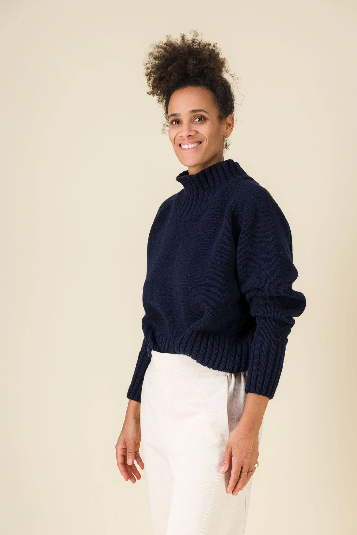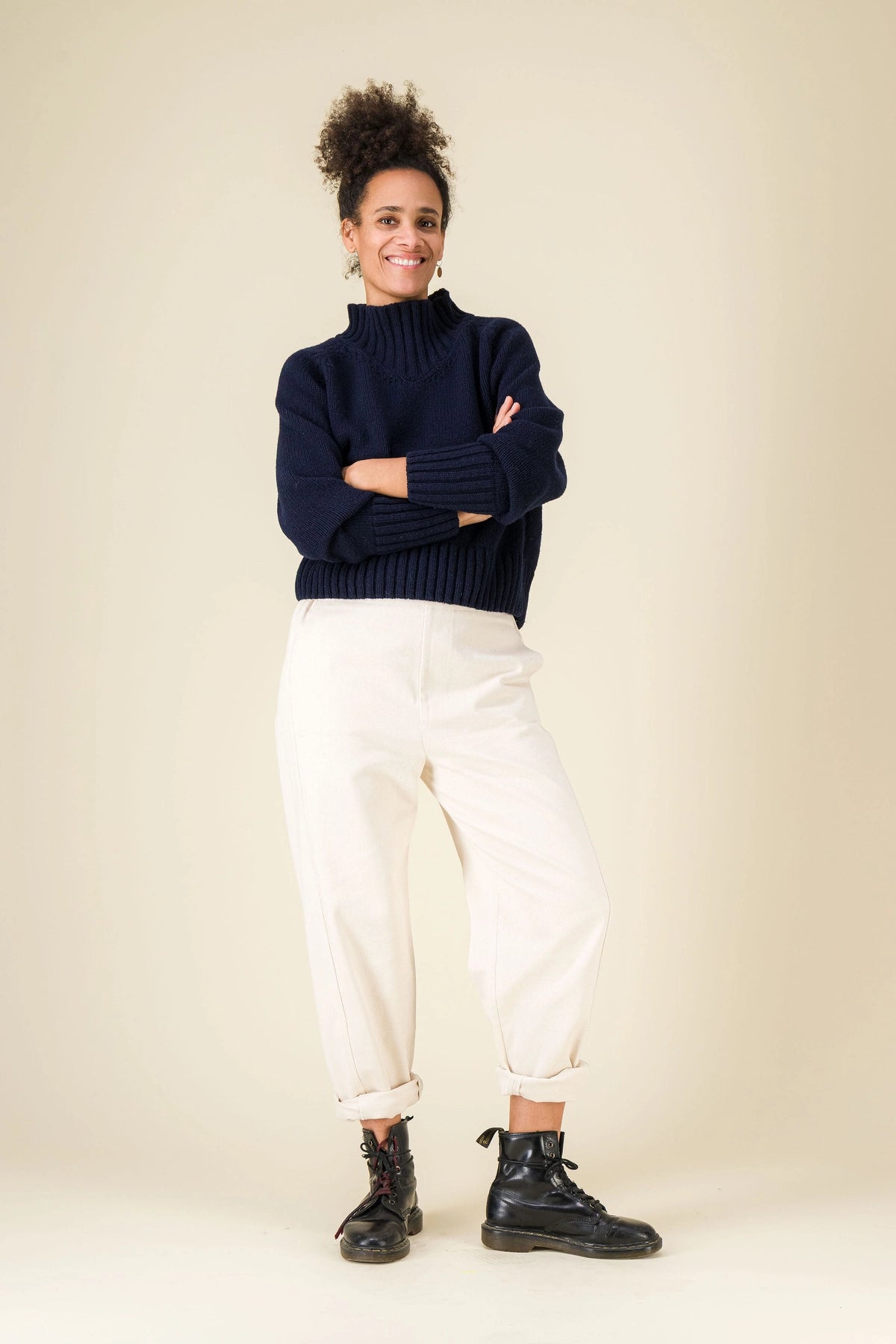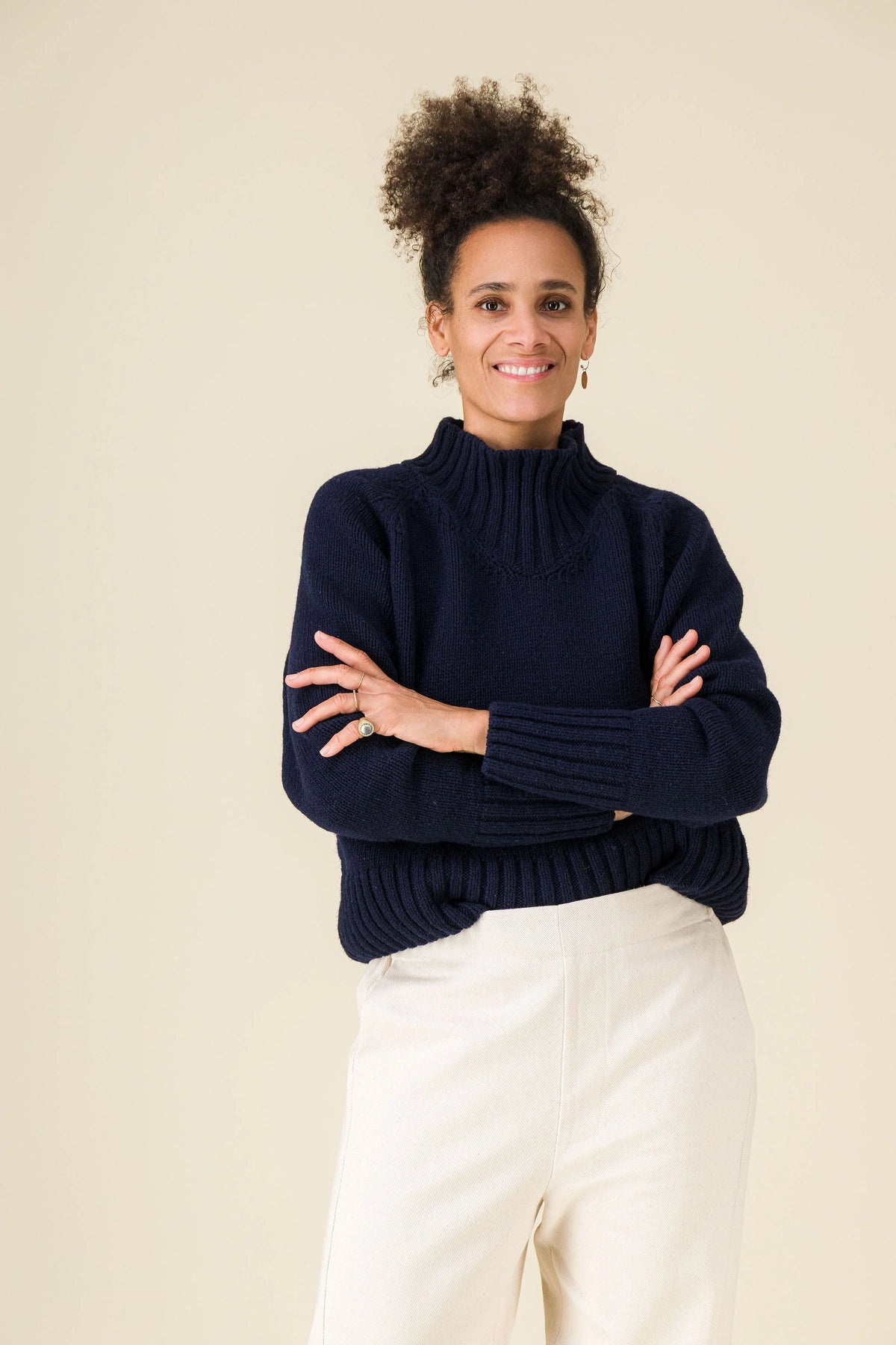 Son col montant à grosses côtes qui descend en pointe sur la poitrine, une prouesse technique réalisée par notre atelier à Roanne.