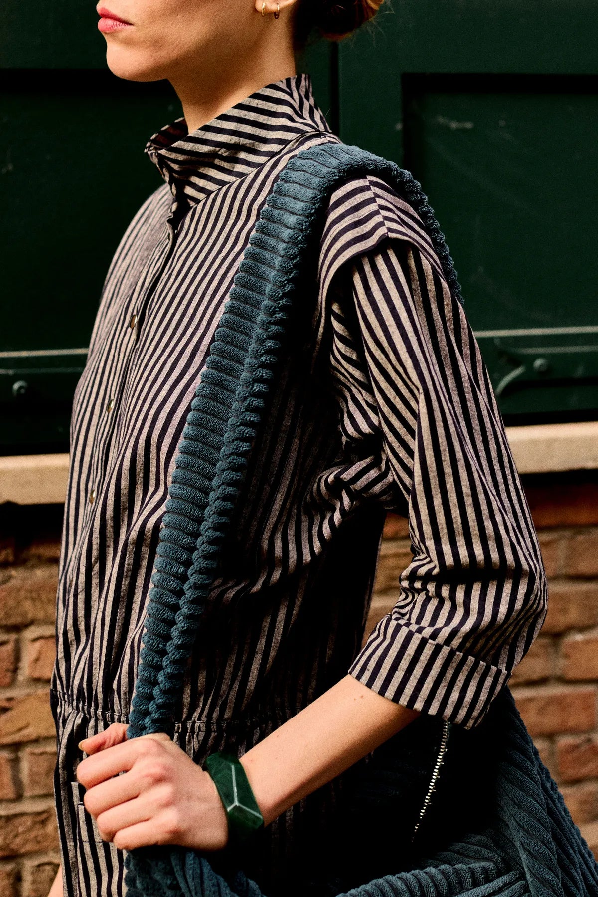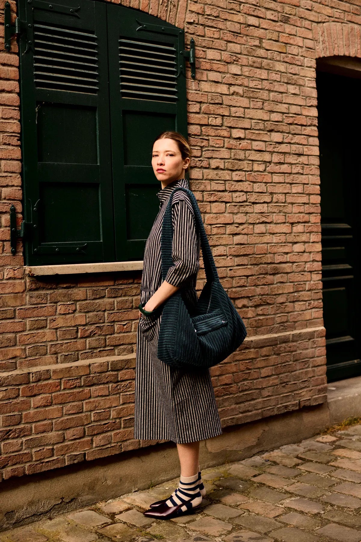 Sac besace pour femme en velours bleu côtelé grosses côtes bleu marine.