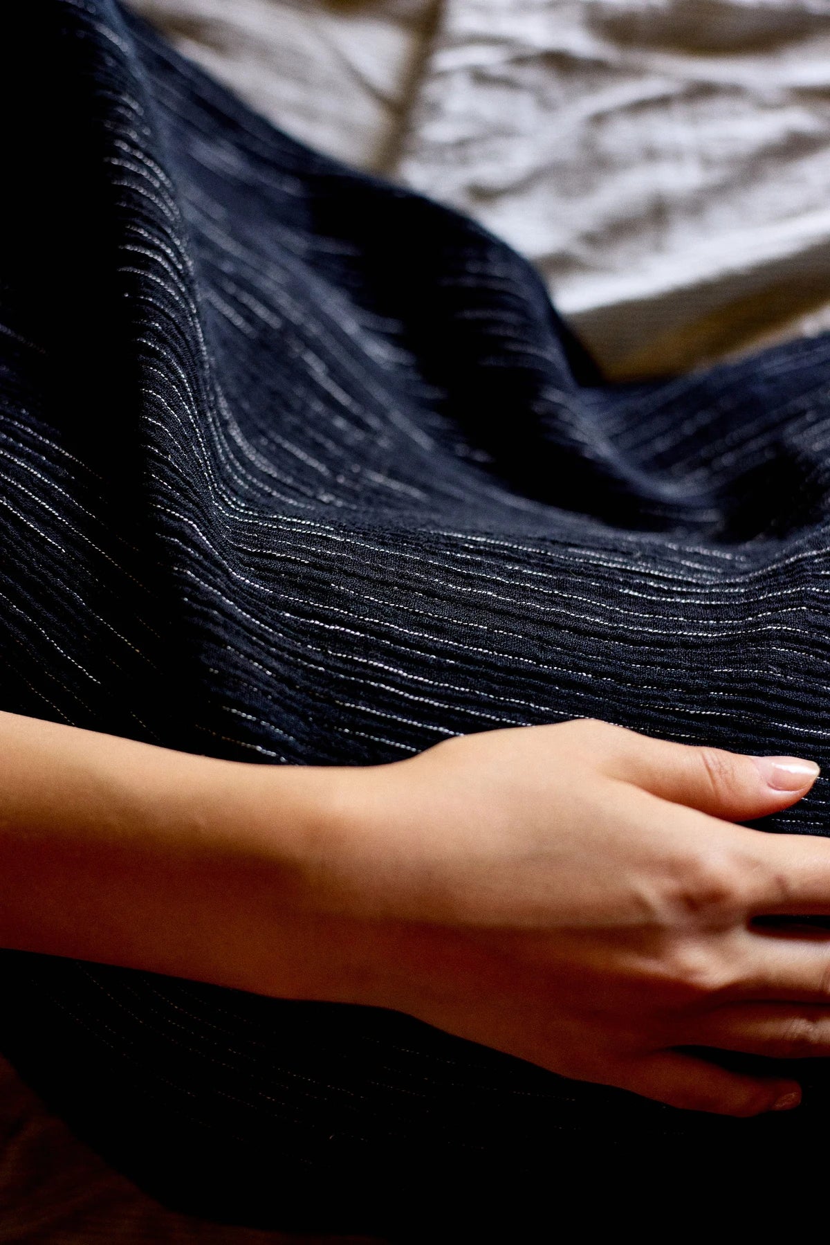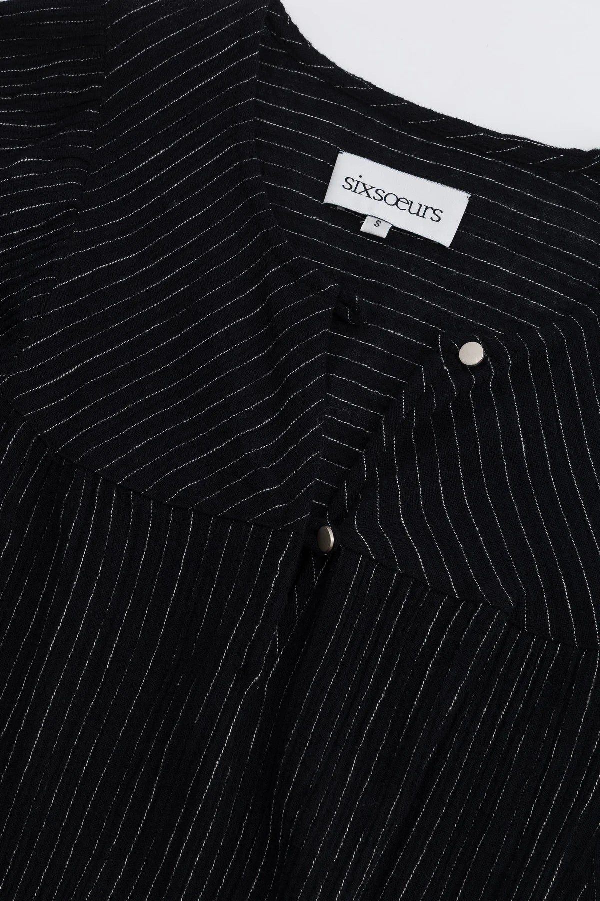 Robe longue droite fendue côté, manches gigots féminines. Empiècement devant petite carrure, fentes côtés.Gaze de lin coton noir rayée.